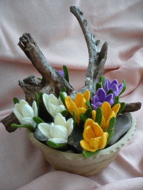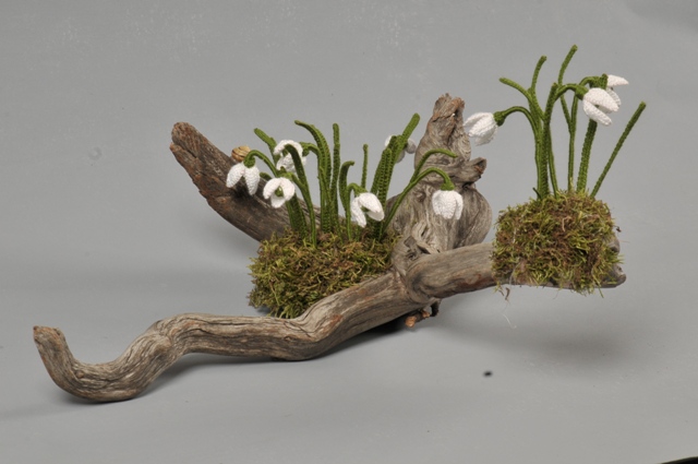 Čia yra keletas darbelių iš mano kolekcijos. Visos gėlės nertos vąšeliu ant tinklelio ir vielytės, o taip pat panaudojant įvairias gamtines medžiagas, šakas įvairius kelmus ir kriaukles.